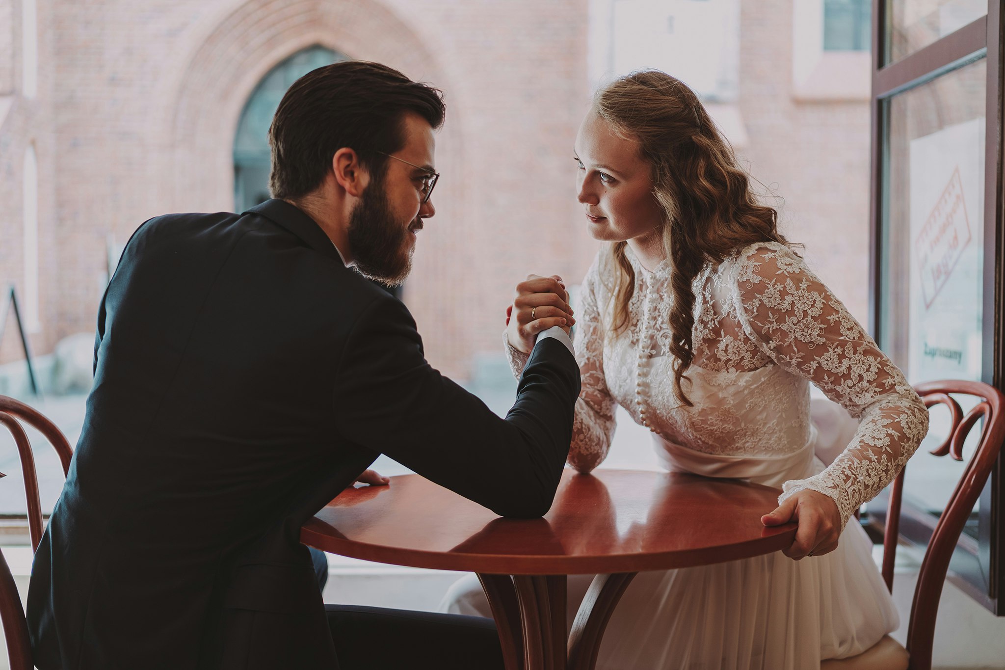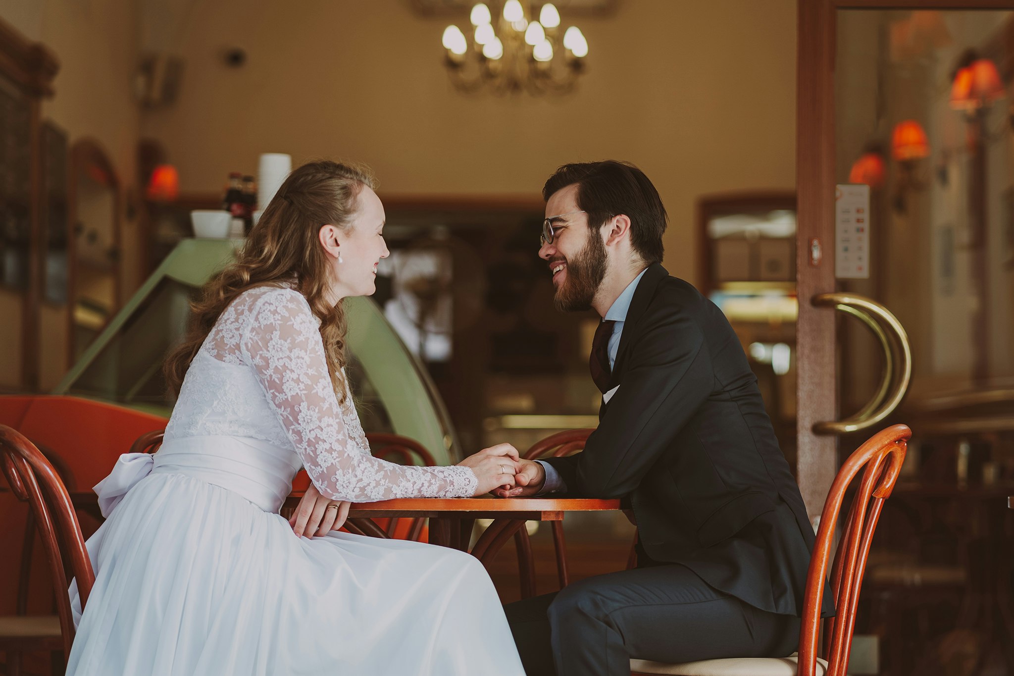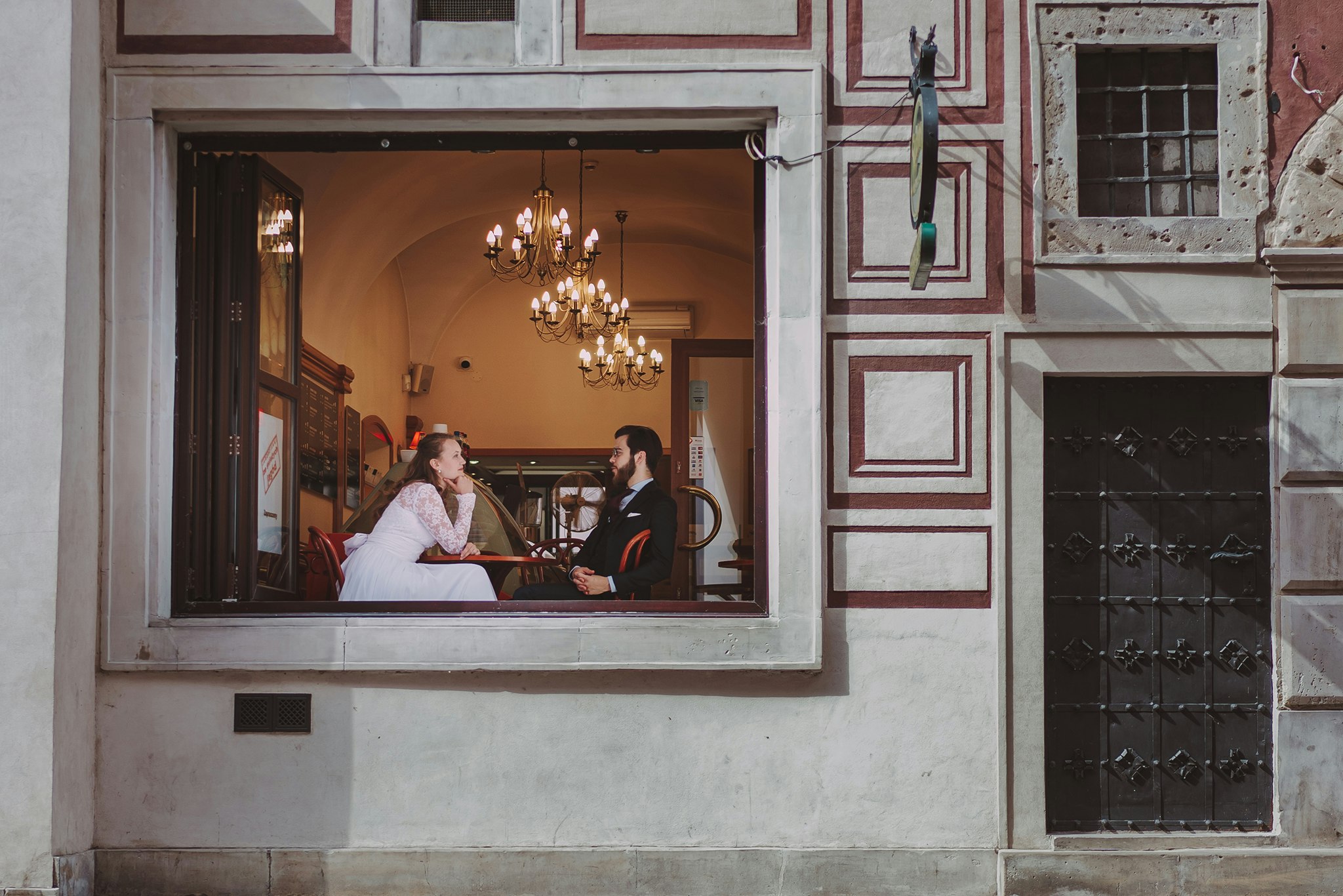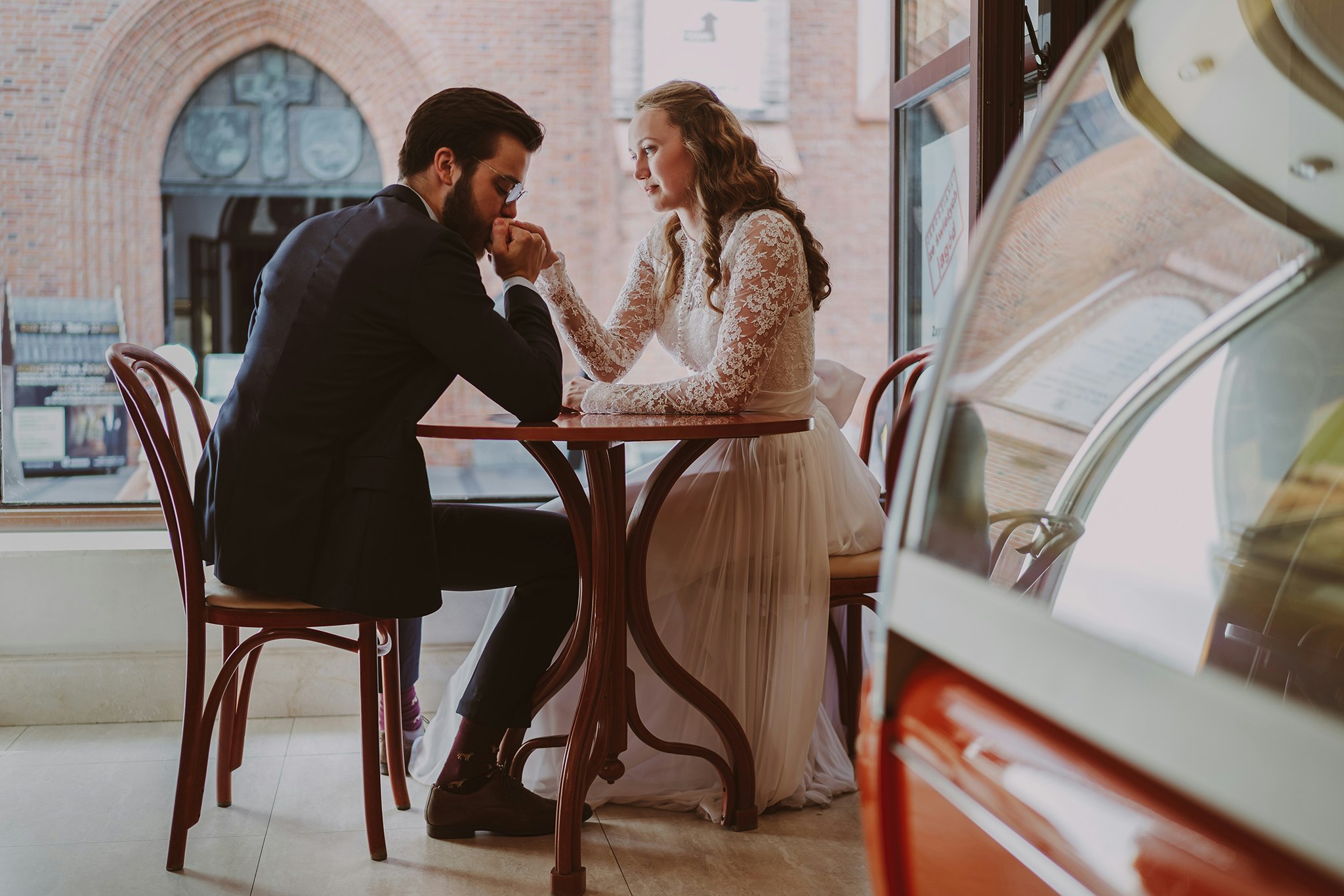 Wspólnie z Anią i Filipem wybraliśmy się w sentymentalną podróż pośród wspomnień związanych z ich pierwszymi wspólnymi chwilami. Pierwsze spacery, pierwsze wspólne kawy, pierwsze zauroczenia. A to wszystko pośród uliczek starego miasta, którego uliczki mieliśmy okazję przemierzać o wschodzie słońca. Zajrzeliśmy też do kawiarni, w której Ania i Filip umówili się na pierwszą randkę. Otworzyła się dokładnie w momencie robienia zdjęć i urzeczeni właściciele nie mogli nam odmówić zrobienia kilku zdjęć wewnątrz.